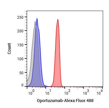 • Flow cytometric analysis of 1X106 MCF-7 cells with Oportuzumab (HY-P990642, red). Cells were fixed with 4% paraformaldehyde. Then stained with the primary antibody at 1/200 dilution for an hour at 4℃. Alexa Fluor 488-conjugated AffiniPure Goat Anti-Human IgG H&L (AF488) (HY-P83776) was used as the secondary antibody at 1/1,000 dilution for 30 minutes at 4℃. Human IgG1 kappa (HY-P99001, blue) was used as the isotype control, cells without incubation with primary antibody were used as the unlabeled control (black).