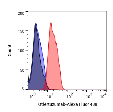 • Flow Cytometry analysis of Raji cells labelling TSPAN26/CD37 (red) with Otlertuzumab (anti-TSPAN26/CD37) (HY-P99212). Goat Anti-Human IgG (Alexa Fluor 488) (HY-P83776) at a dilution of 1/1000 was used as the secondary antibody. Blue-Human IgG1 kappa (HY-P99001). Black-Unlabelled control, cells without incubation with primary antibody.