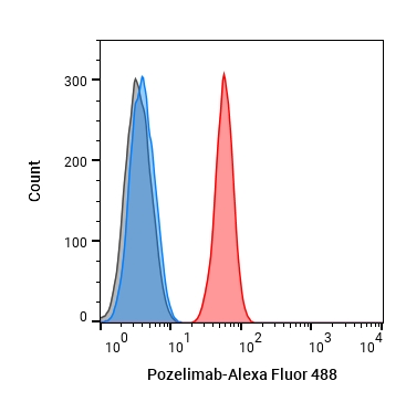 • Flow cytometric analysis of 1X106 HepG2 cells with Pozelimab (HY-P99786, red). Cells were fixed with 4% paraformaldehyde and permeabilised with 90% methanol. Then stained with the primary antibody at 1/50 dilution for an hour at 4℃. Alexa Fluor 488-conjugated AffiniPure Goat Anti-Human IgG H&L (HY-P83776) was used as the secondary antibody at 1/1,000 dilution for 30 minutes at 4℃. Human IgG4 kappa Isotype Control (HY-P99003, blue) was used as the isotype control, cells without incubation with primary antibody were used as the unlabeled control (black).