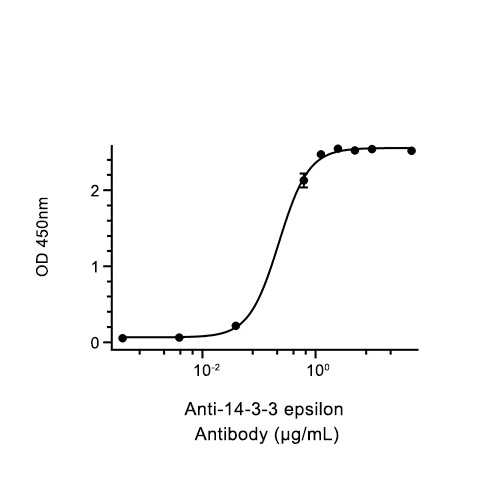 Immobilized Mouse 14-3-3 epsilon at 2 μg/mL (100 μL/well) can bind Anti-14-3-3 epsilon Antibody. The ED50 for this effect is 0.2259 μg/mL.