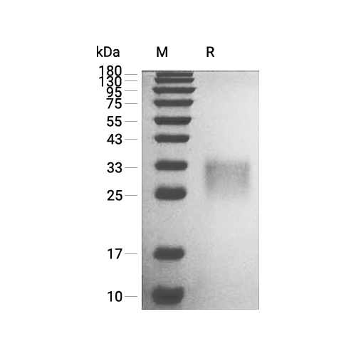 Approximately 24-33 kDa, based on SDS-PAGE under reducing conditions, due to the glycosylation.
