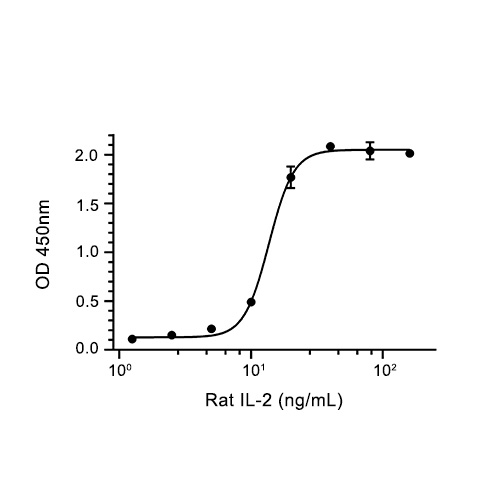IL-2 Protein, produced by activated T-cells, NK cells, and helper T-cells, is crucial for immune response and tolerance. It binds to receptor complexes, activating downstream signaling pathways. IL-2 Protein acts as a growth factor, enhances NK-cell activity, promotes B-cell proliferation, and regulates regulatory T-cells. It also participates in differentiating effector T-cell subsets and memory CD8-positive T-cells. IL-2 Protein, Rat (HEK293, His) is the recombinant rat-derived IL-2 protein, expressed by HEK293 , with C-6*His labeled tag.