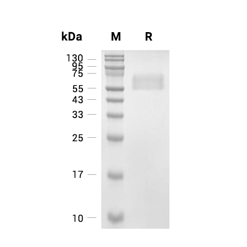 Approximately 56-80 kDa, based on SDS-PAGE under reducing conditions, due to the glycosylation.
