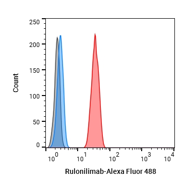 • Flow cytometric analysis of 1X106 10 ng/mL PMA and 1 μg/mL Ionomycin co-stimulated Jurkat cells(24h) with Rulonilimab (HY-P99895, red). Cells were fixed with 4% paraformaldehyde. Then stained with the primary antibody at 1/200 dilution for an hour at 4℃. Alexa Fluor 488-conjugated AffiniPure Goat Anti-Human IgG H&L (HY-P83776) was used as the secondary antibody at 1/1,000 dilution for 30 minutes at 4℃. Human IgG1 kappa (HY-P99001, blue) was used as the isotype control, cells without incubation with primary antibody were used as the unlabeled control (black).
