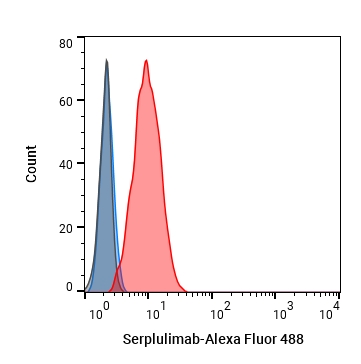 • Flow cytometric analysis of 1X106 10 ng/mL PMA and 1 μg/mL Ionomycin co-stimulated Jurkat cells (24h) with Serplulimab (HY-P99118, red). Cells were fixed with 4% paraformaldehyde. Then stained with the primary antibody at 1/200 dilution for an hour at 4℃. Alexa Fluor 488-conjugated AffiniPure Goat Anti-Human IgG H&L (HY-P83776) was used as the secondary antibody at 1/1,000 dilution for 30 minutes at 4℃. Human IgG4 kappa (HY-P99003, blue) was used as the isotype control, cells without incubation with primary antibody were used as the unlabeled control (black).