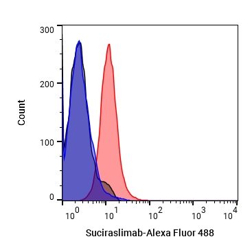 • Flow Cytometry analysis of Raji cells labelling Siglec-2/CD22 (red) with Suciraslimab (anti-Siglec-2/CD22) (HY-P990781). Goat Anti-Human IgG (Alexa Fluor 488) (HY-P83776) at a dilution of 1/1000 was used as the secondary antibody. Blue-Human IgG1 kappa (HY-P99001). Black-Unlabelled control, cells without incubation with primary antibody.