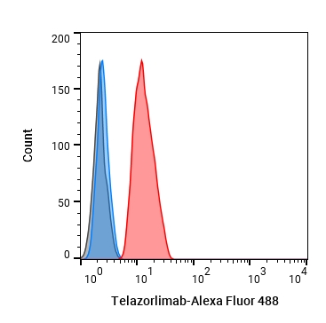 • Flow cytometric analysis of 1X106 500 ng/mL anti-CD3 and 500 ng/mL ant-CD28 co-stimulated Jurkat cells(24h) with Telazorlimab (HY-P99570, red). Cells were fixed with 4% paraformaldehyde. Then stained with the primary antibody at 1/200 dilution for an hour at 4℃. Alexa Fluor 488-conjugated AffiniPure Goat Anti-Human IgG H&L (HY-P83776) was used as the secondary antibody at 1/1,000 dilution for 30 minutes at 4℃. Human IgG1 kappa (HY-P99001, blue) was used as the isotype control, cells without incubation with primary antibody were used as the unlabeled control (black).