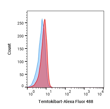 • Flow cytometric analysis of 1.5×106 HT-29 cells labeling Temtokibart (HY-P990016, red). Cells were fixed with 4% paraformaldehyde. Then stained with the primary antibody at 1/200 dilution for an hour at 4℃. Alexa Goat Anti-Human IgG H&L (AF488) (HY-P83776) was used as the secondary antibody at 1/1,000 dilution for 30 minutes at 4℃. Human IgG1 lambda2 Isotype Control (HY-P990096, blue) was used as the isotype control.