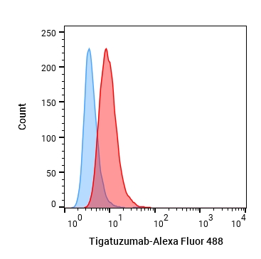 • Flow cytometric analysis of 1.5X106 HEPG2 cells with Tigatuzumab (HY-P99270, red). Cells were fixed with 4% paraformaldehyde. Then stained with the primary antibody at 1/200 dilution for an hour at 4℃. Goat Anti-Human IgG H&L (AF488) (HY-P83776) was used as the secondary antibody at 1/1,000 dilution for 30 minutes at 4℃. Human IgG1 kappa, Isotype Control (HY-P99001, blue) was used as the isotype control.