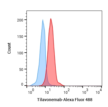 • Flow cytometric analysis of 1.5X106 SHSY5Y cells labeling Tilavonemab (HY-P99163, red). Cells were fixed with 4% paraformaldehyde. Then stained with the primary antibody at 1/200 dilution for an hour at 4℃. Goat Anti-Human IgG H&L (AF488) (HY-P83776) was used as the secondary antibody at 1/1,000 dilution for 30 minutes at 4℃. Human IgG4 kappa, Isotype Control (HY-P99003, blue) was used as the isotype control.