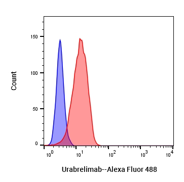 • Flow cytometric analysis of 1X106 A549 cells with Urabrelimab (HY-P99533, red). Cells were fixed with 4% paraformaldehyde. Then stained with the primary antibody at 1/200 dilution for an hour at 4℃. Alexa Fluor 488-conjugated AffiniPure Goat Anti-Human IgG H&L (AF488) (HY-P83776) was used as the secondary antibody at 1/1,000 dilution for 30 minutes at 4℃. Human IgG4 kappa (HY-P99003, blue) was used as the isotype control.