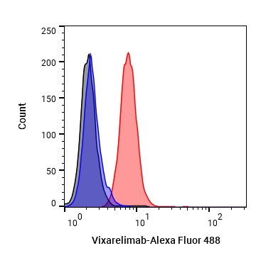 • Flow Cytometry analysis of Hela cells labelling OSMR (red) with Vixarelimab (anti-OSMR) (HY-P99519). Goat Anti-Human IgG (Alexa Fluor 488) (HY-P83776) at a dilution of 1/1000 was used as the secondary antibody. Blue-Human IgG1 kappa (HY-P99001). Black-Unlabelled control, cells without incubation with primary antibody.