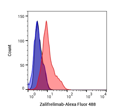 • Flow Cytometry analysis of Raji cells labelling CTLA4 (red) with Zalifrelimab (anti-CTLA4) (HY-P99514). Goat Anti-Human IgG (Alexa Fluor 488) (HY-P83776) at a dilution of 1/1000 was used as the secondary antibody. Blue-Human IgG1 kappa (HY-P99001). Black-Unlabelled control, cells without incubation with primary antibody.